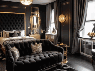 Transform your bedroom into a glamorous and luxurious space by incorporating black furniture with chic accents, elegant lighting fittings, and captivating wall art that elevate the overall ambiance and style of the room.